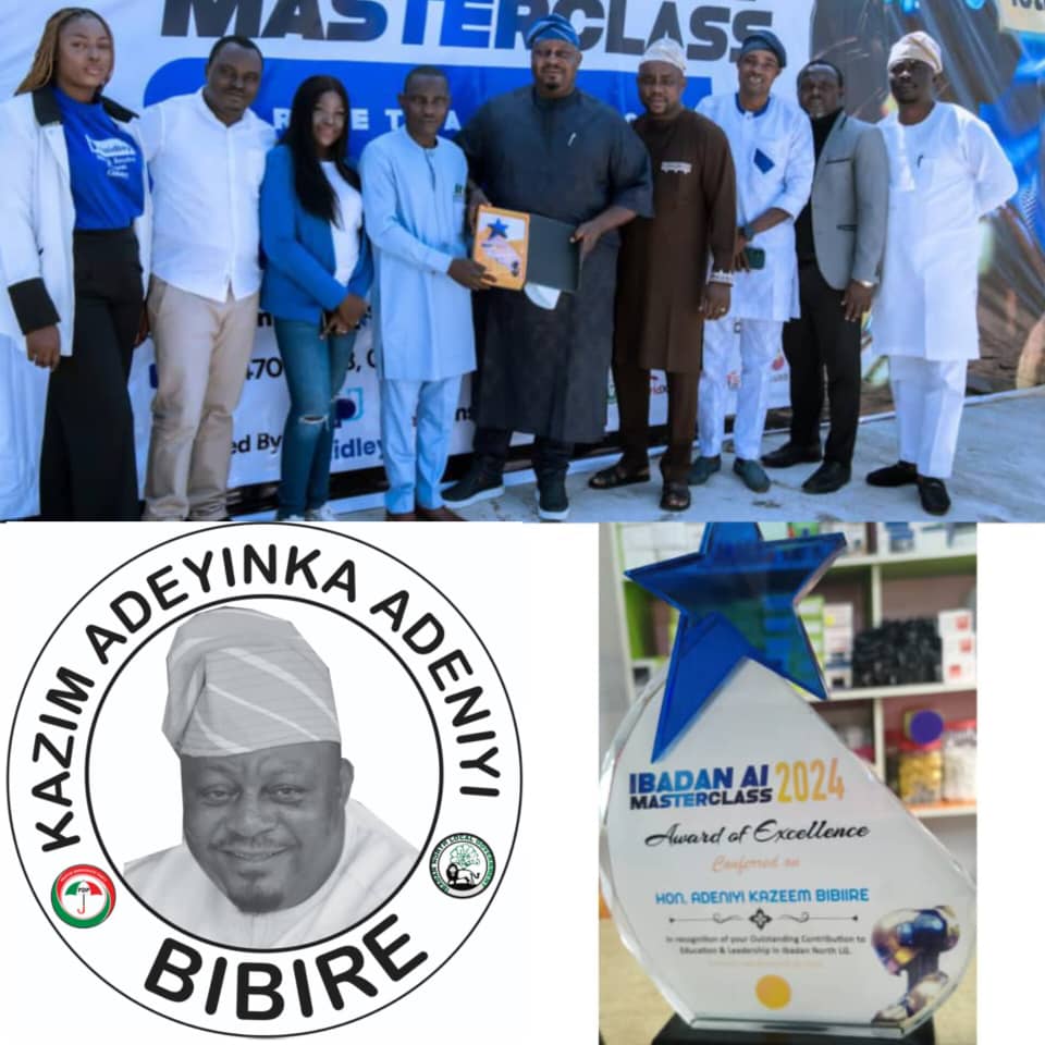 The former Special Adviser to Governor Seyi Makinde on Local Government and Chieftaincy Matters, Hon. Kazim Adeniyi Adeyinka Bibire, was honored by the Ibadan AI MasterClass 2024 for his exceptional contributions to education and leadership in the Ibadan North Local Federal Constituency.