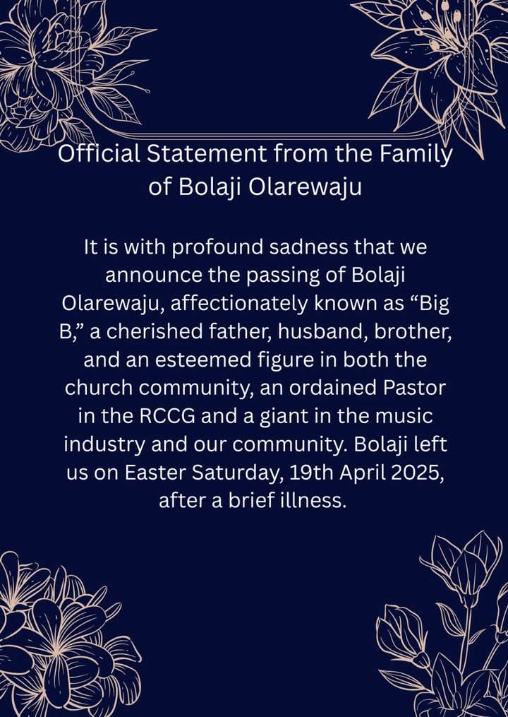 News of his death has sent shockwaves across social media, with fans and fellow gospel artists expressing their grief and disbelief. Tributes continue to pour in, highlighting the deep impact Big Bolaji had on the gospel music community and beyond.