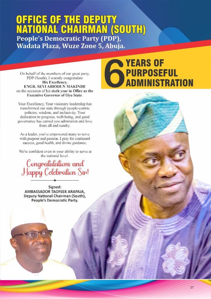According to Arapaja, “on behalf of the members of our great party, PDP (South), I warmly congratulate His Excellency, Engr. Seyi Abiodun Makinde on the occasion of his sixth year in Office as the Executive Governor of Oyo State.