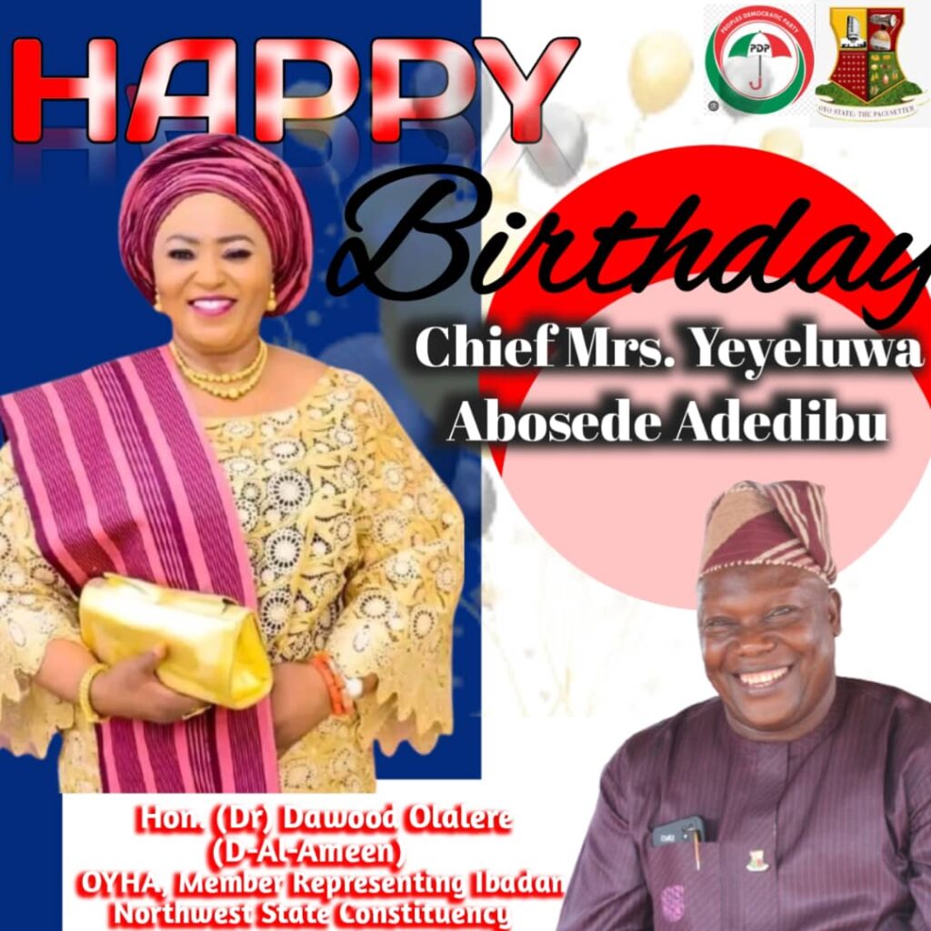 A member of the Oyo State House of Assembly representing Ibadan NorthWest State Constituency, Hon. (Dr.) Dawood Olalere D-Al-Ameen has extended warm birthday wishes to Chief (Mrs) Yeyeluwa Abosede Adedibu, the South West Woman Leader of the Peoples Democratic Party (PDP), praising her as a woman of great virtue and remarkable impact.