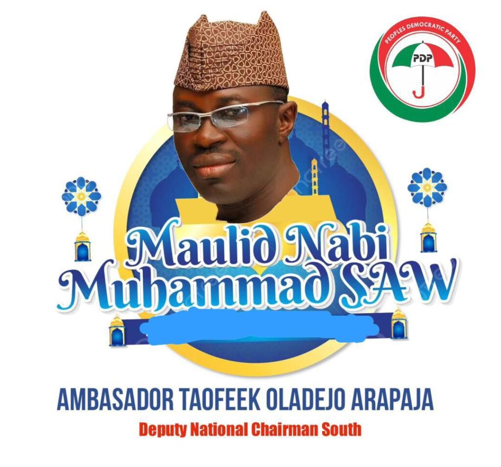 As Muslims around the world celebrated Eid el-Maulud this year, the Peoples Democratic Party’s (PDP) deputy national chairman for the south, Ambassador Taofeek Arapaja, has congratulated the Muslim ummah in Nigeria urging them to continue to pray for Nigerians and its current leaders.
