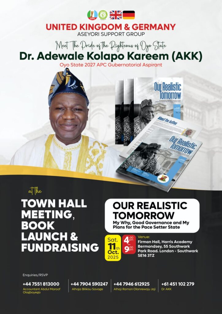 In a bid to further engage supporters and showcase his vision for Oyo State, APC gubernatorial aspirant, Dr. Adewale Kolapo Kareem (AKK), popularly hailed as “The Pride of the Righteous of Oyo State”, has announced a series of international events scheduled for October 2025.