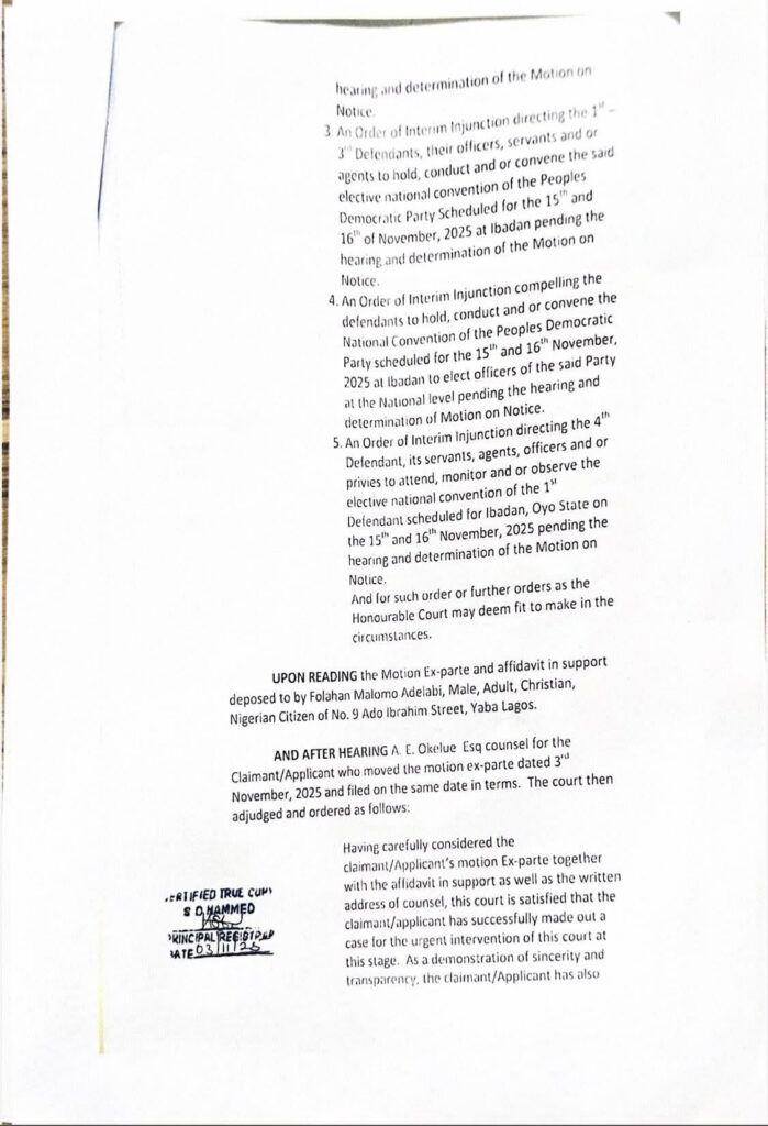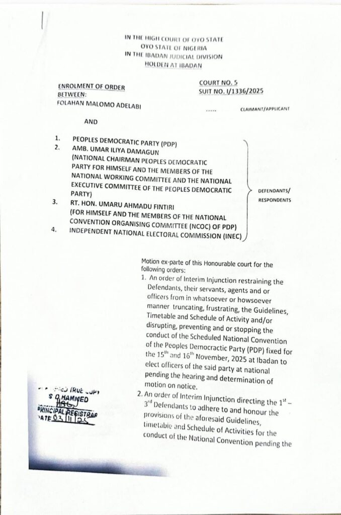 Adelabi asked the court for an interim injunction restrained the defendants from “truncating, frustrating, the Guidelines, Timetable and Schedule of Activity and/or disrupting, preventing and or stopping the conduct of the Scheduled National Convention of the Peoples Democractic Party (PDP) fixed for the 15th and 16th November, 2025 at Ibadan to elect officers of the said party at national pending the hearing and determination of motion on notice”.