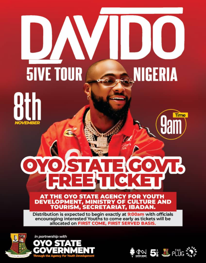In a move aimed at promoting youth engagement and supporting the creative industry, the Executive Governor of Oyo State, His Excellency, Engr ‘Seyi Makinde, has approved the distribution of thousands of free tickets to young residents across the state for Davido’s upcoming ‘5ive’ Tour in Ibadan.