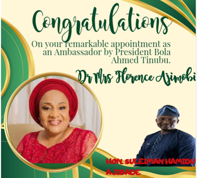 Akinyele/Lagelu Federal Constituency hopeful and esteemed son of the revered royal father of Ibadanland, Hon. Suleiman Hamidu Ajibade, has extended his heartfelt congratulations to the distinguished matriarch of the Ajimobi political dynasty, Dr. (Mrs.) Florence Ajimobi, on her remarkable appointment as an Ambassador by President Bola Ahmed Tinubu.